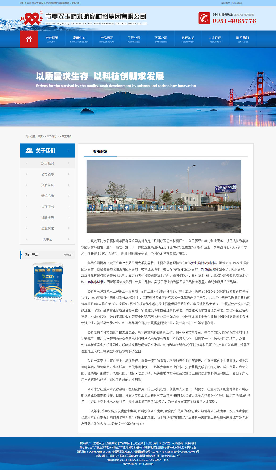 寧夏雙玉防水防腐材料集團(tuán)有限公司其前身是“銀川雙玉防水材料廠”,公司歷經(jīng)15年的創(chuàng)業(yè)磨練,現(xiàn)已成長為集建筑防水材料研發(fā)、生產(chǎn)、銷售、施工于一體的企業(yè)集團(tuán)和西北地區(qū)防水行業(yè)的龍頭和標(biāo)桿企業(yè),公司占地面積4萬多平方米,注冊資本3000萬元人民幣,集團(tuán)下屬4家子公司,全國各地設(shè)有23家經(jīng)銷部。