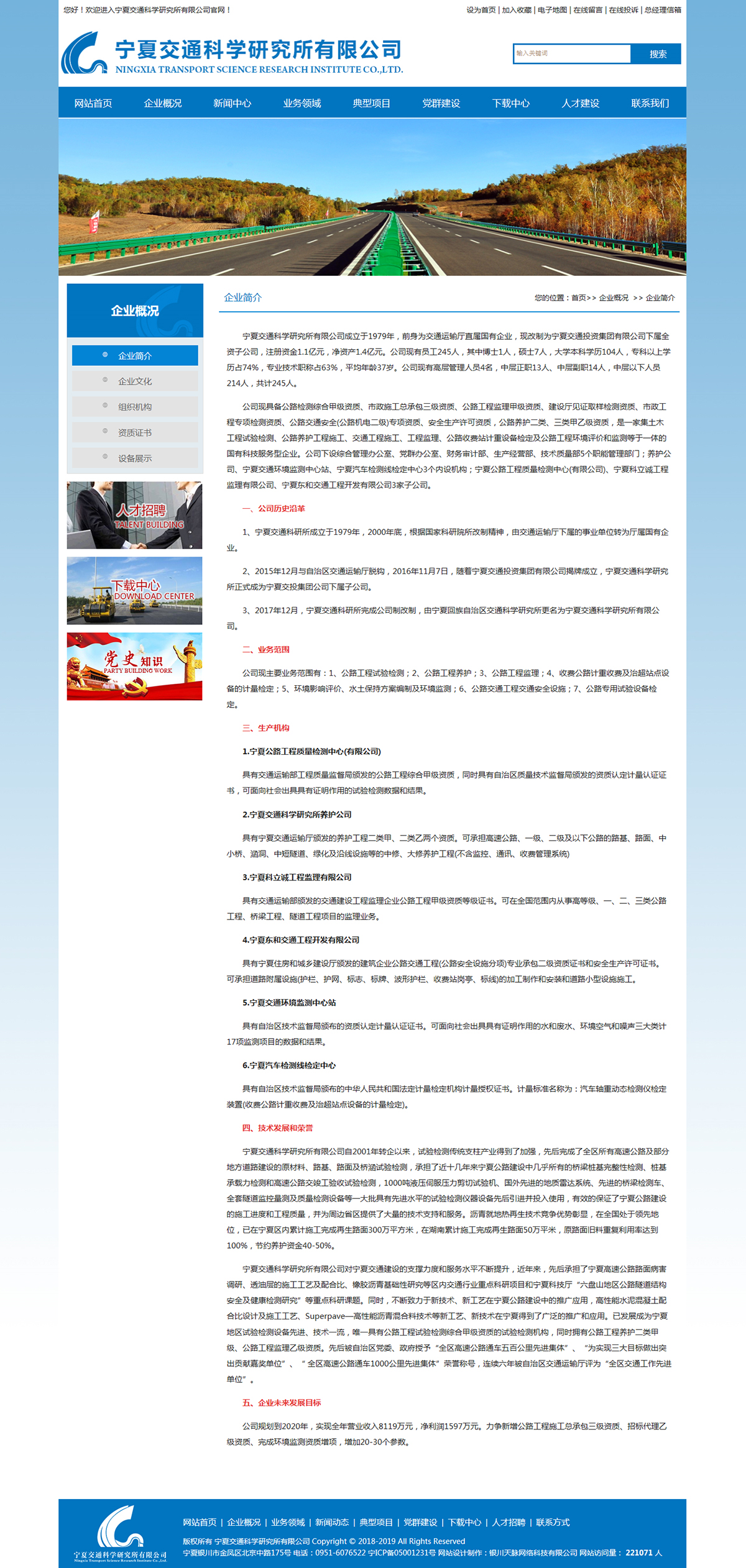 寧夏交通科學(xué)研究所有限公司成立于1979年,前身為交通運(yùn)輸廳直屬國有企業(yè),現(xiàn)改制為寧夏交通投資集團(tuán)有限公司下屬全資子公司,注冊資金1.1億元,凈資產(chǎn)1.4億元