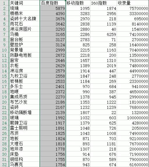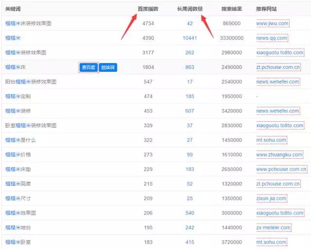 從中我們知道哪些關(guān)鍵詞是這個(gè)行業(yè)中最能帶來客戶的詞匯,包括移動(dòng)和360的指數(shù),以及收錄量。但是我們也知道這些詞競爭度大,如果是權(quán)重不高的網(wǎng)站,很難和大站搶奪位置,那么我們就需要從長尾詞下手。