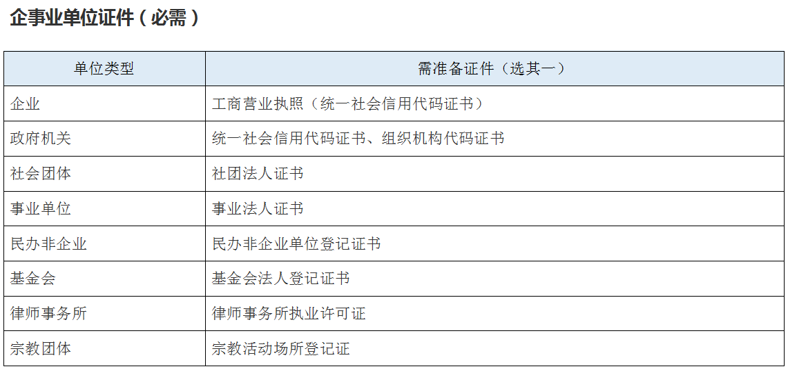 1、必須要有相關(guān)企業(yè)資格證明資料(營業(yè)執(zhí)照、事業(yè)單位/社會團(tuán)體/民辦非企業(yè)/機(jī)關(guān)等帶有統(tǒng)一社會信用代碼的單位證件)