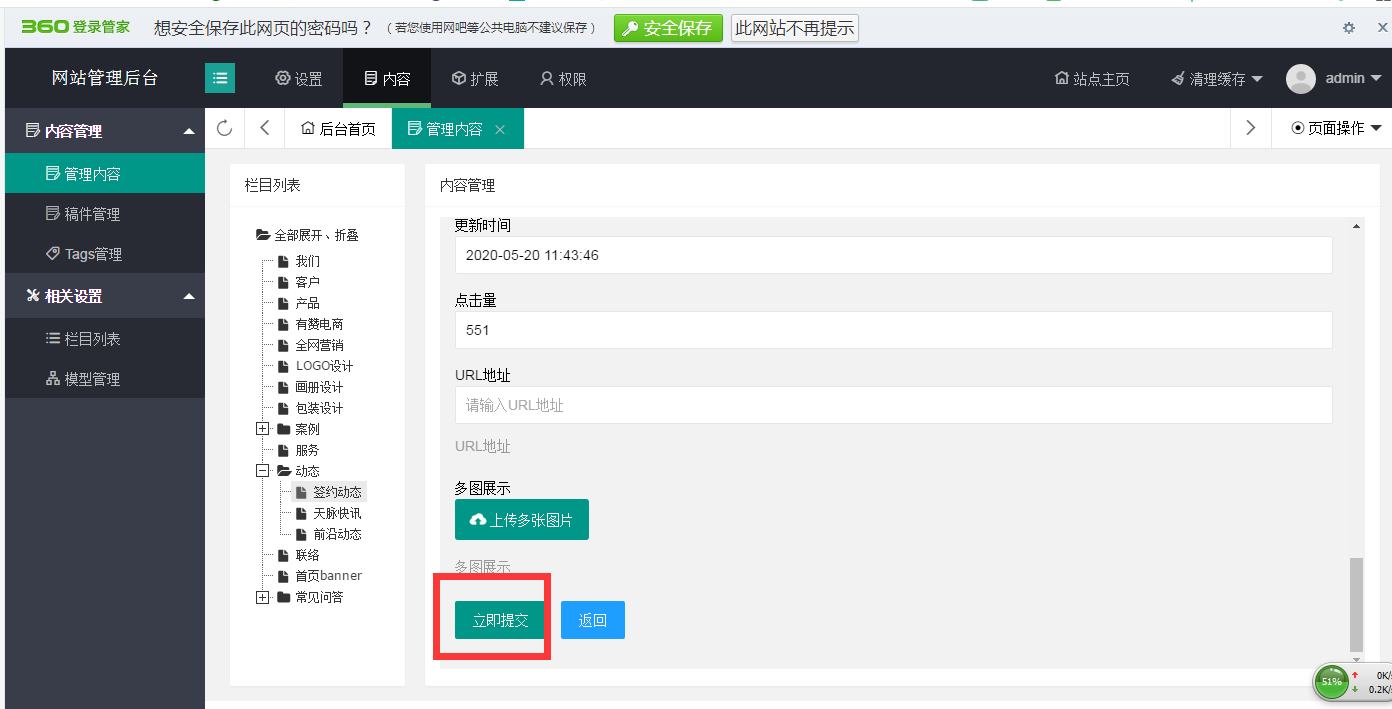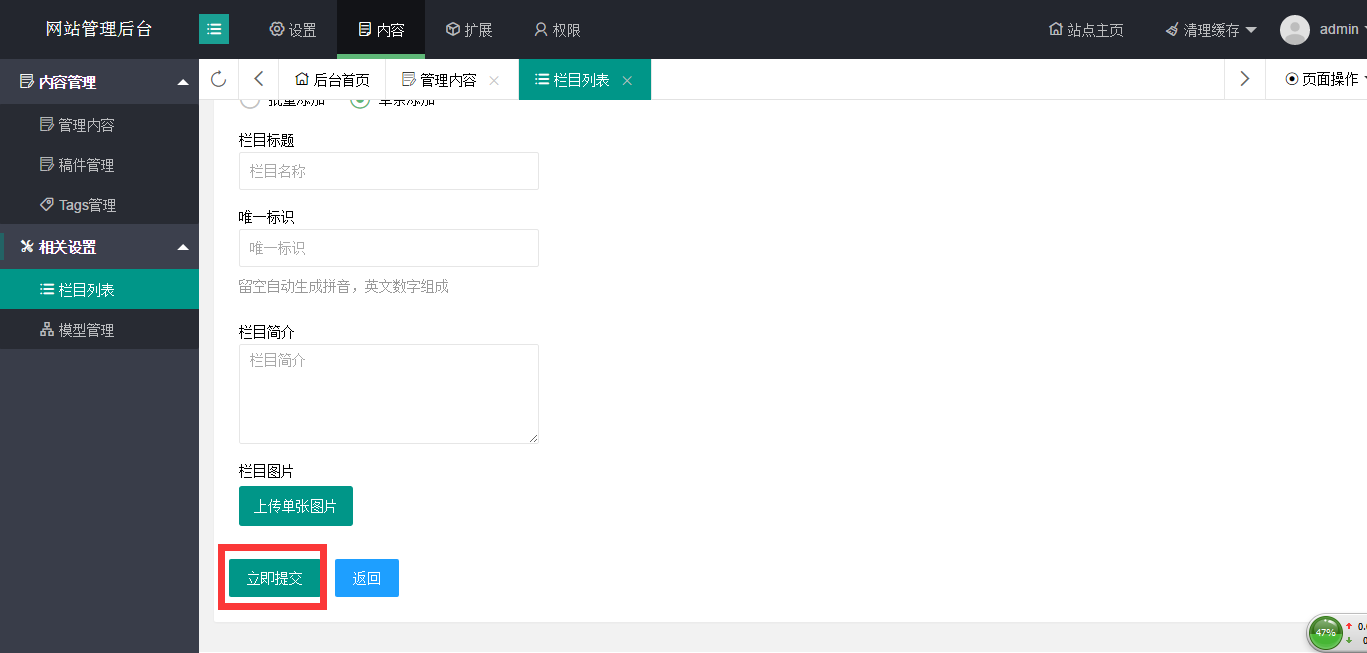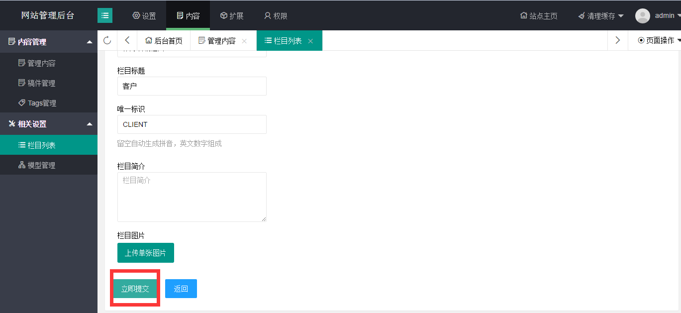 添加子欄目時,選擇相對應(yīng)的一級欄目,然后添加子欄目,將圖中紅框所指的內(nèi)容添加完整后,點擊立即提交即可。