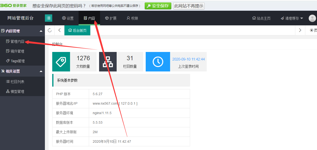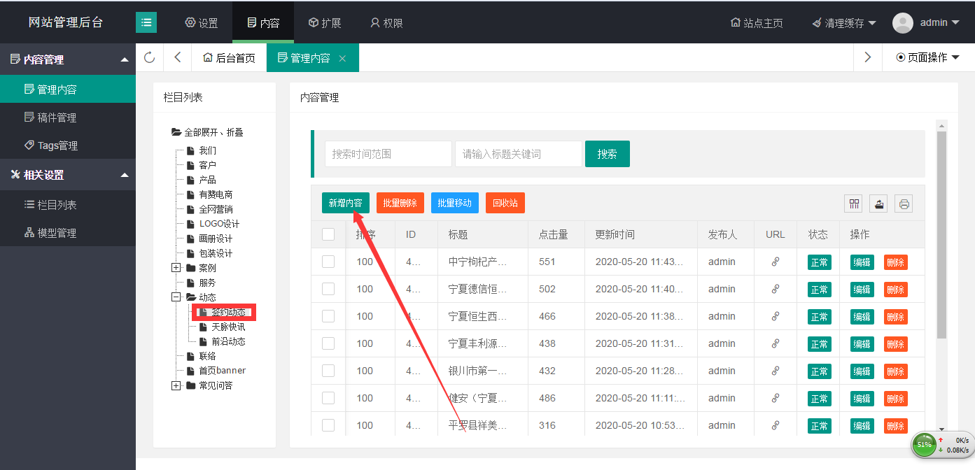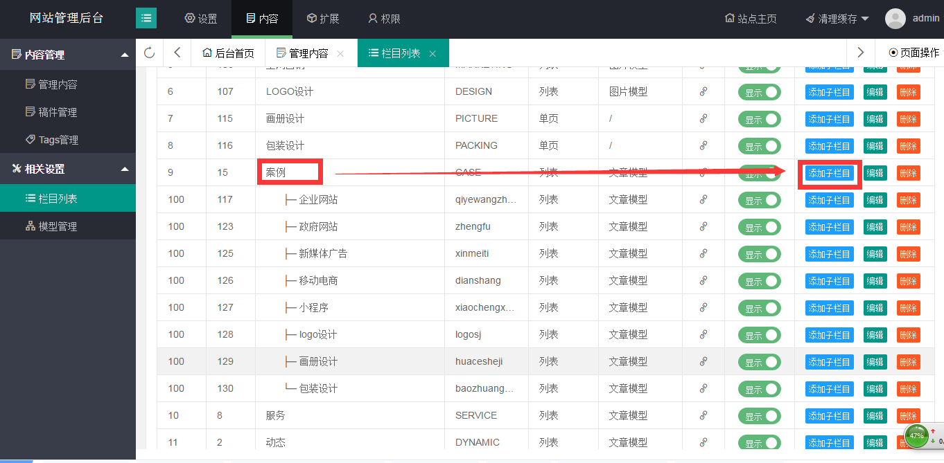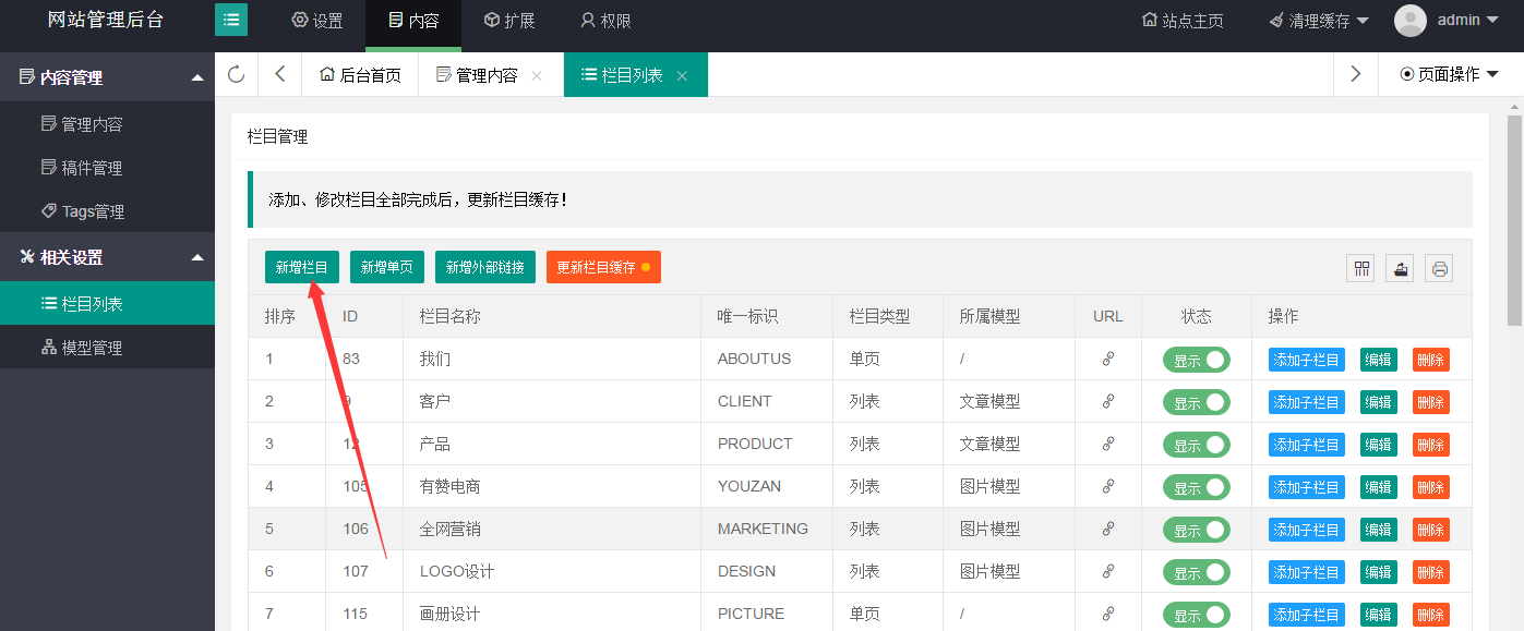 添加內(nèi)容時,點擊內(nèi)容,再點擊左側(cè)的管理內(nèi)容,就會出現(xiàn)相對應(yīng)的欄目