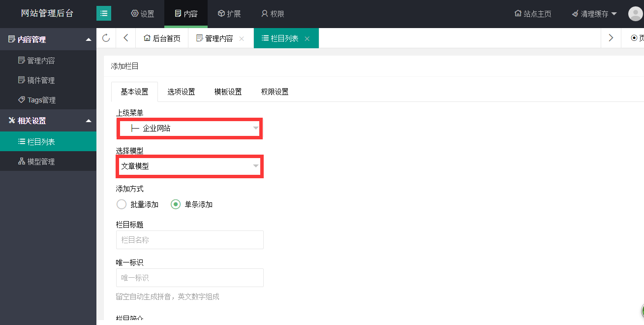 添加新的欄目時,點擊新增欄目,紅框中的內(nèi)容添加完整,然后點擊立即添加即可。