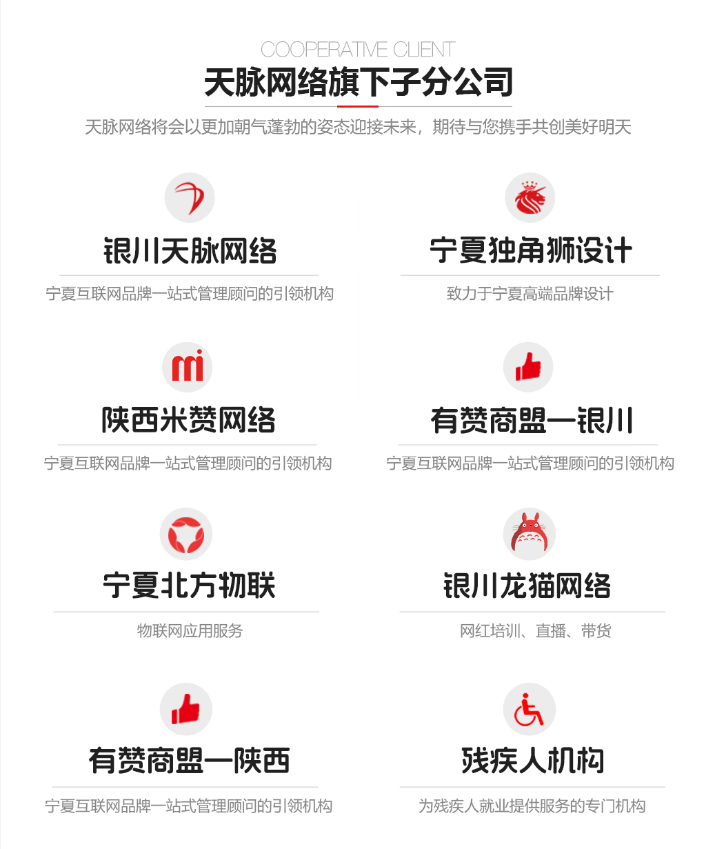 銀川天脈網(wǎng)絡(luò)公司成立于2007年,至今18年,公司注冊資金600萬元,現(xiàn)有員工50多人,已成功為本土3000多家企事業(yè)單位提供優(yōu)質(zhì)的互聯(lián)網(wǎng)整體解決方案。并從品牌建設(shè)初期到整體信息化建設(shè)中后期,天脈網(wǎng)絡(luò)積累了大量的實(shí)戰(zhàn)經(jīng)驗(yàn)。公司下設(shè)六個(gè)子公司、六個(gè)項(xiàng)目部,及七個(gè)職能部門,分別是:綜合事務(wù)部、技術(shù)研發(fā)部、PC事業(yè)部移動(dòng)事業(yè)部、新媒體事業(yè)部、設(shè)計(jì)部、推廣部、財(cái)務(wù)部。