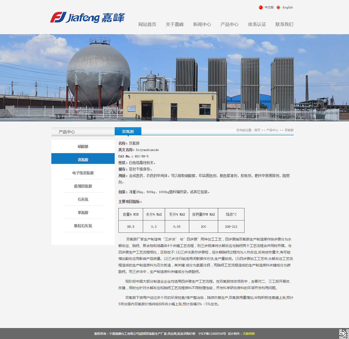 寧夏嘉峰化工有限公司一直專注于氰胺類產(chǎn)品的研發(fā)、生產(chǎn),現(xiàn)已建成以雙氰胺為核心的產(chǎn)業(yè)鏈。