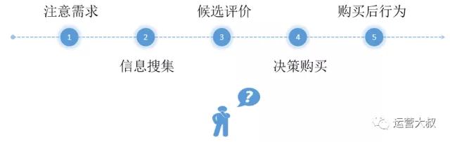 首先,我們可以理解成消費者的購買階段,為了比較好說明,這里把用戶購買分為5個階段,如下圖: