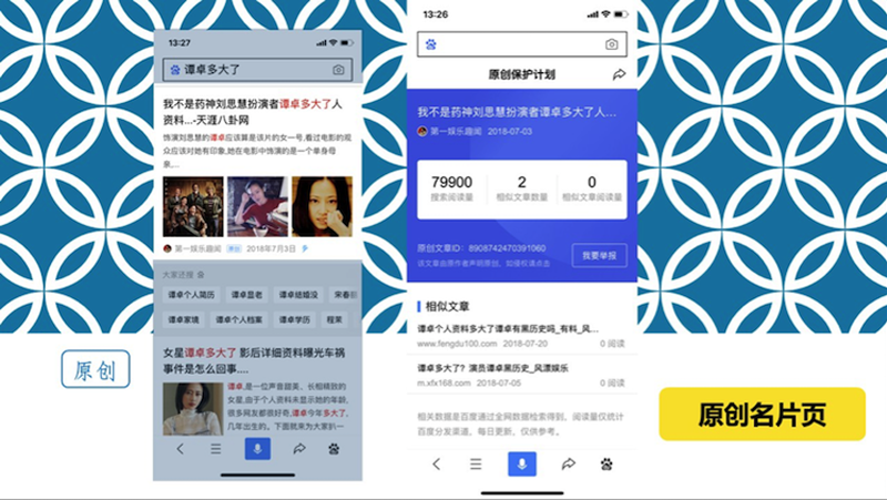 原創(chuàng)文章閱讀量、全網(wǎng)資源下相似文章數(shù)量及其閱讀量均展現(xiàn)在原創(chuàng)名片頁中,幫助原創(chuàng)內(nèi)容生產(chǎn)者建立原創(chuàng)品牌口碑、幫助網(wǎng)站判定是否存在惡意采集。