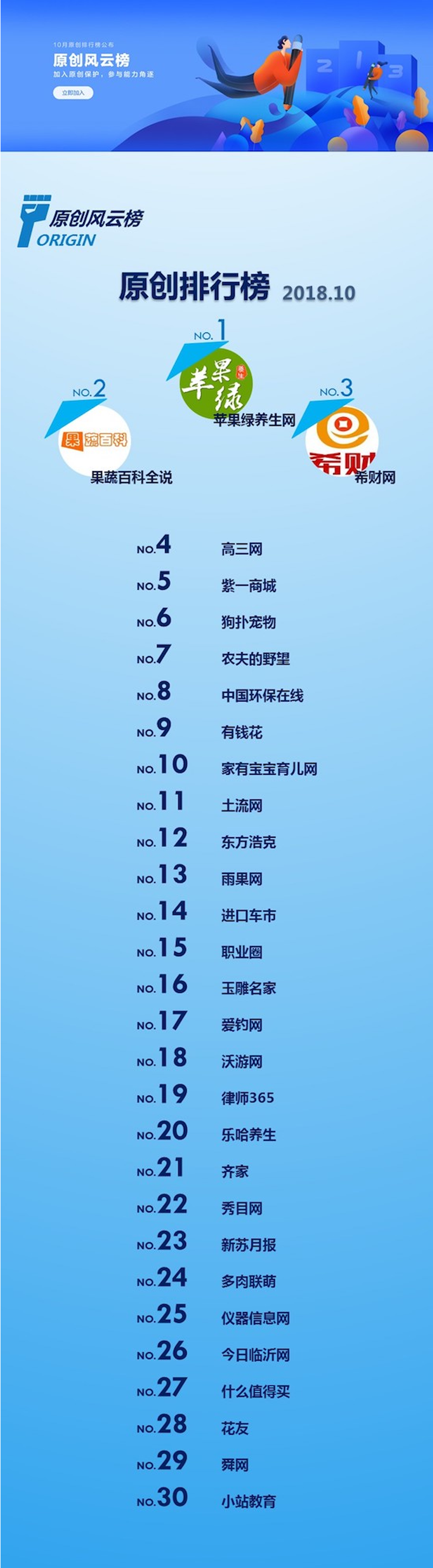依據(jù)2018年10月全網(wǎng)數(shù)據(jù),百度評選出2018年10月原創(chuàng)內(nèi)容最具影響力的TOP30網(wǎng)站,原創(chuàng)影響力月度排行榜首次張榜公示如下。