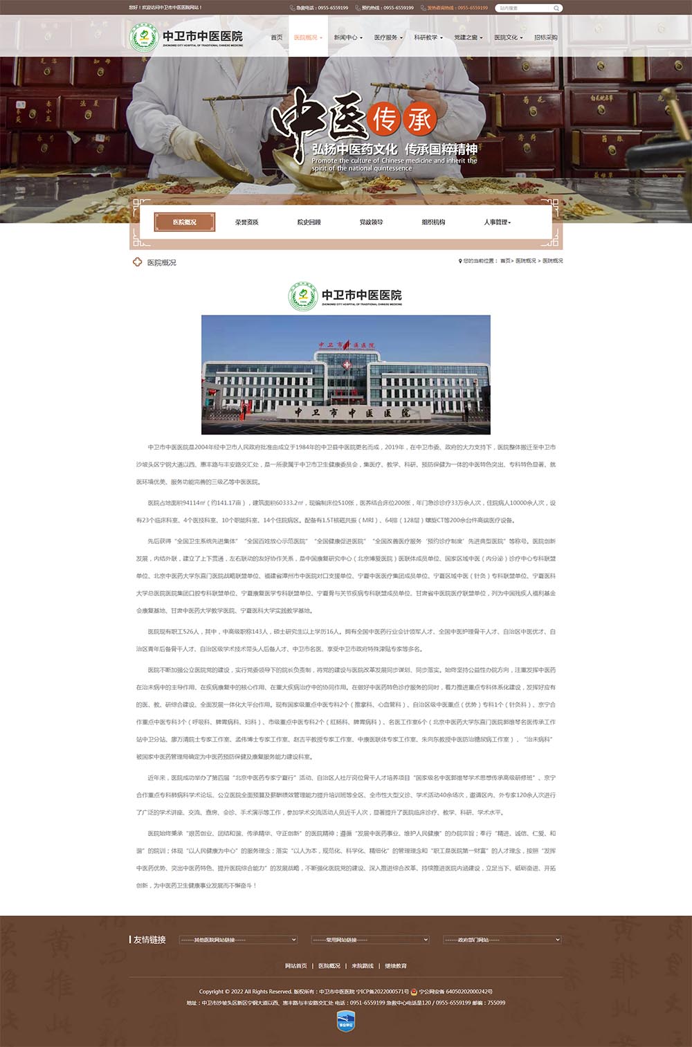 中衛(wèi)市中醫(yī)醫(yī)院是2004年經(jīng)中衛(wèi)市人民政府批準(zhǔn)由成立于1984年的中衛(wèi)縣中醫(yī)院更名而成,2019年,在中衛(wèi)市委、政府的大力支持下,醫(yī)院整體搬遷至中衛(wèi)市沙坡頭區(qū)寧鋼大道以西、惠豐路與豐安路交匯處,是一所隸屬于中衛(wèi)市衛(wèi)生健康委員會(huì),集醫(yī)療、教學(xué)、科研、預(yù)防保健為一體的中醫(yī)特色突出、??铺厣@著、就醫(yī)環(huán)境優(yōu)美、服務(wù)功能完善的三級(jí)乙等中醫(yī)醫(yī)院。